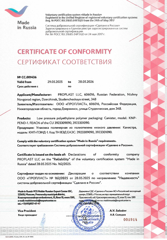 Сертификат выдан на широкий спектр продукции: канистры и флаконы от 0,1 л до 30 л.